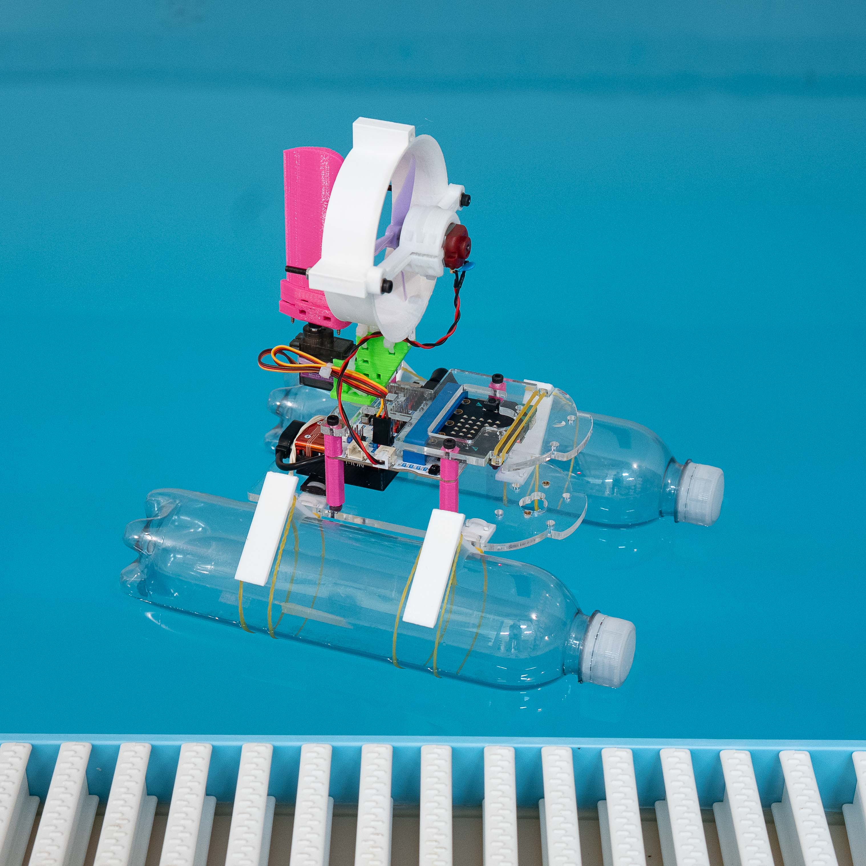 In this course, students build a small micro:bit-controlled BottleBoat using recycled plastic bottles, a fan-driven propeller, and a steering rudder. The project is designed as a hands-on introduction to engineering, combining building, testing, and simple programming in MakeCode for micro:bit.